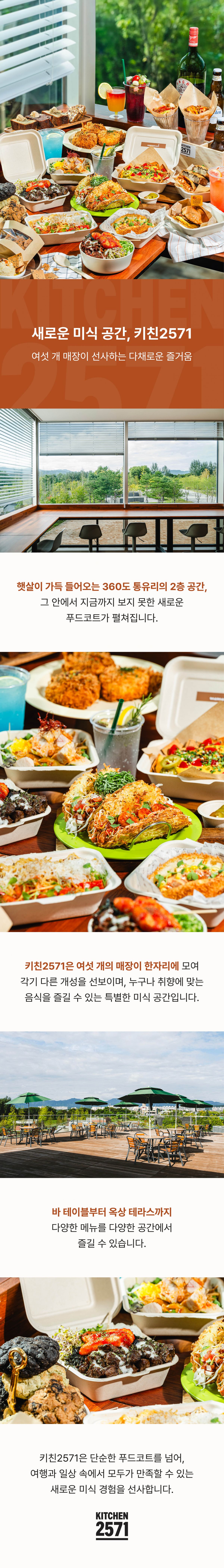 키친2571은 360도 통유리로 햇살이 가득 들어오는 세련된 공간에서 여섯 개 매장이 선사하는 다채로운 미식을 즐길 수 있는 새로운 푸드코트입니다.